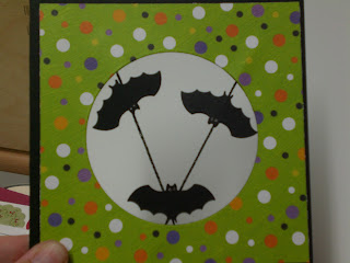 The paper is from the doodlebug collection a few years back. I used glittery black thread which I taped inbetween the paper layer and card layer. I used my circle scissor cutting thing to make the openings.I used a red glitter pen for the eyes on the bats.....
